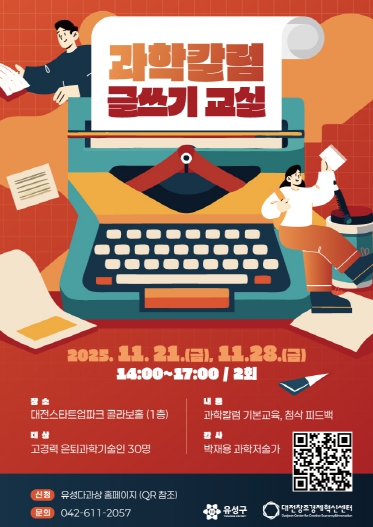 [뉴스노크=김인호 기자] 대전 유성구는 오는 21일과 28일 대전스타트업파크센터에서 고경력 은퇴 과학기술인 대상 ‘과학 칼럼 글쓰기 교실’을 운영한다.