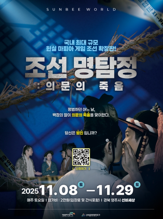 [뉴스노크=김인호 기자] 영주시 선비세상에서 오는 11월 8일부터 매주 토요일, 참가자가 직접 조선시대 인물이 되어 연쇄 살인 사건의 진실을 밝혀야 하는 국내 최대 규모 체험형 마피아 게임 ‘조선명탐정: 의문의 죽음’이 개최된다.