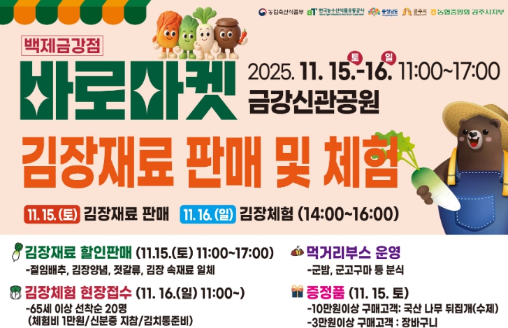 [뉴스노크=김인호 기자] 공주시는 본격적인 김장철을 맞아 지역 농산물 소비를 촉진하고 시민들에게 체험 기회를 제공하기 위해 ‘바로마켓 김장 재료 판매 및 체험 행사’를 오는 15일과 16일 이틀간 공주 금강신관공원에서 연다고 밝혔다.