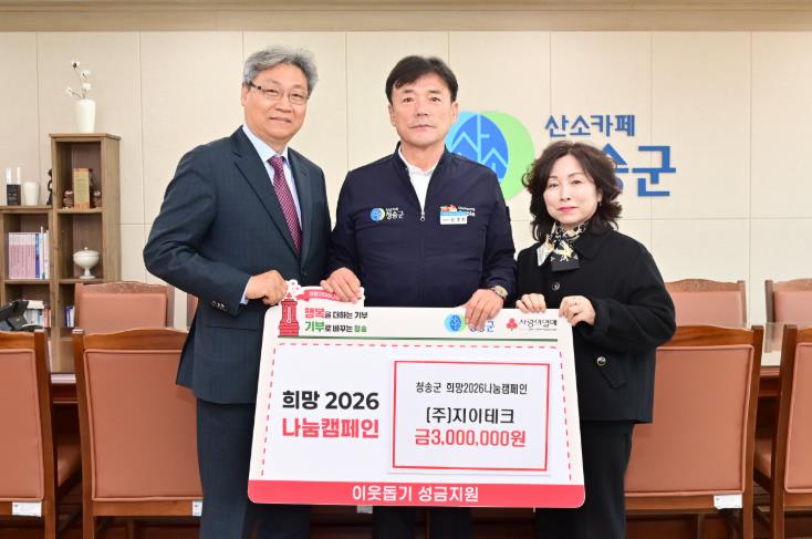 [뉴스노크=김인호 기자] 청송군은 지난 22일 대구시에 소재한 하수도 기술진단 및 환경기술전문업체 ㈜지이테크가 이웃돕기 성금 300만 원을 기탁했다고 밝혔다.