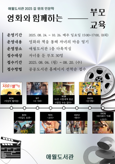 [뉴스노크=김인호 기자] 제주시 애월도서관은 오는 8월 4일부터 전성실 작가를 모시고 ‘영화와 함께하는 부모교육’ 문화프로그램 참가자를 모집한다.