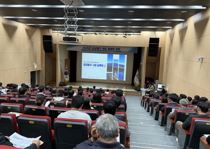 [뉴스노크=김인호 기자] 서귀포시에서는 침체된 건설경기 활성화의 발판을 마련하고자 대한건설협회(전문포함) 회원 및 건설업 면허 등록업체 종사자 등 100여 명이 참석한 가운데 ‘'26년도 공공발주 사업 설명회’를 1월 16일 14시에 서귀포시청 별관 2층 문화강좌실에서 개최했다.