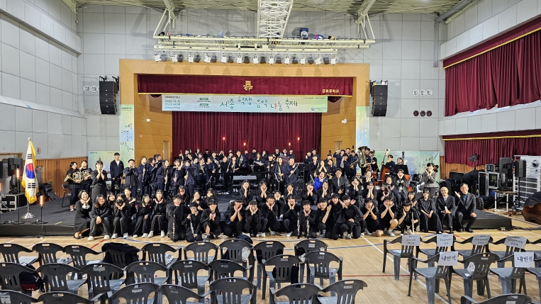 [뉴스노크=김인호 기자] 세종특별자치시교육청은 11월 4일에 금호중학교 다목적강당에서 금호중학교(교장 강승연, 이하 금호중)의 ‘금호윈드오케스트라’(지도교사 조현영, 지휘자 연춘흠)와 연서중학교(교장 유효종)의 ‘연서오케스트라’(지도교사 이은정, 지휘자 김채연)가 함께 만드는 ‘2025 세종예술온(ON)학교’ 예술학교 ‘세종 학생 음악 나눔 축제’를 성황리에 마쳤다.