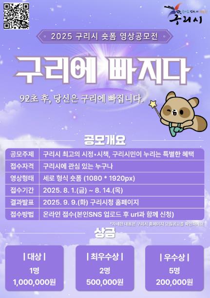 [뉴스노크=김인호 기자] 구리시는 즐거운 변화, 더 행복한 구리시를 알리고자, 2025 구리시 숏폼 영상 공모전‘구리에 빠지다’를 개최한다.