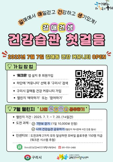 [뉴스노크=김인호 기자] 구리시 갈매건강생활지원센터는 7일부터 갈매동 주민들의 일상 속 걷기 실천을 장려하고 건강한 생활 습관 형성을 지원하기 위해, 모바일 걷기 앱 워크온(WalkOn)을 활용한 비대면 건강 커뮤니티 ‘갈매건생 건강습관 첫걸음’을 개설하고 본격 운영에 나섰다.