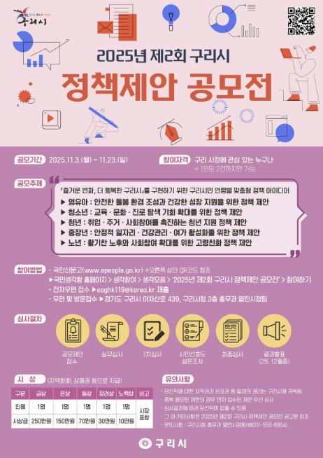 [뉴스노크=김인호 기자] 구리시는 오는 11월 3일부터 11월 23일까지'2025년 제2회 구리시 정책 제안 공모전'을 개최한다고 밝혔다. 이번 공모전의 주제는 ‘구리 시민(영유아·청소년·청년·중장년·노년) 나이별 맞춤형 정책 아이디어’다.