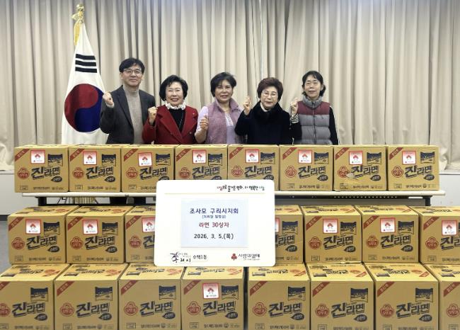 [뉴스노크=김인호 기자] 구리시는 지난 3월 5일 ‘조사모(좋은 사람들의 모임)’ 연예인봉사단 구리시지회가 수택1동 행정복지센터를 방문해 지역 내 어려운 이웃을 위해 라면 40개들이 30상자를 기부했다고 밝혔다.