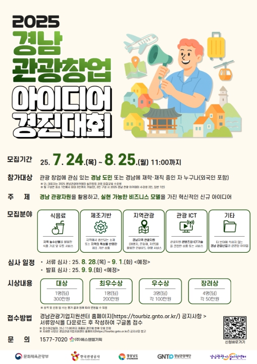 [뉴스노크=김인호 기자] 경상남도는 31일 경남관광재단 관광기업지원센터 주관으로 지역 관광자원을 활용한 혁신적인 아이디어를 보유한 예비·초기 창업자를 발굴하고 관광 분야 창업 활성화를 도모하기 위해 ‘2025 경남 관광 창업 아이디어 경진대회’를 개최한다고 발표했다.