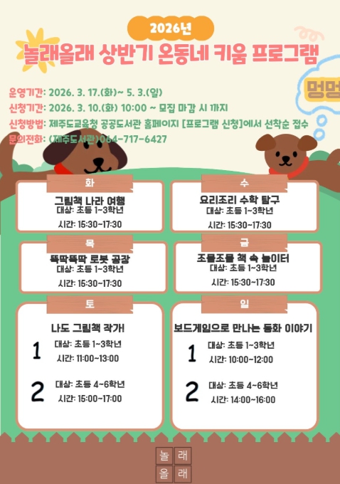 [뉴스노크=김인호 기자] 제주도교육청 제주도서관은 도내 초등학생들의 알찬 방과 후와 주말 활동을 지원하기 위해 2026년 상반기 주중·주말 온동네 키움 프로그램’을 본격 운영한다.