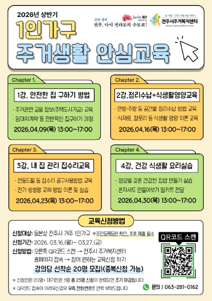 [뉴스노크=김인호 기자] 전주시 주거복지센터(센터장 오은주)는 1인 가구의 안정적이고 독립적인 주거 정착을 돕기 위해 오는 4월 9일부터 30일까지 매주 목요일 오후 1시부터 약 4시간 동안 전주시 실거주 1인 가구를 대상으로 ‘2026년 상반기 1인 가구 주거생활 안심교육’을 운영한다.