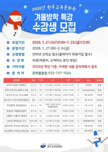 [뉴스노크=김인호 기자] 원주교육문화관(관장 용석태)은 1월 21일부터 23일까지 관내 초·중학생을 대상으로 겨울방학 특강 수강생을 모집한다.