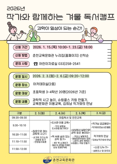 참가 신청은 1월 15일부터 23일까지이며, 춘천교육문화관 누리집을 통해 선착순 20명을 모집한다.
