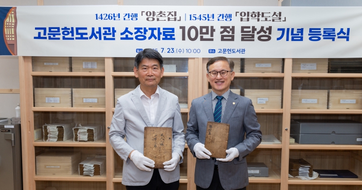 고문헌도서관 소장자료 10만 점 돌파 기념행사에서 권진회 총장은 10만 번째 자료인 《양촌집》에, 이석배 고문헌도서관장은 10만 1번째 자료인 《입학도설》에 날인했다.