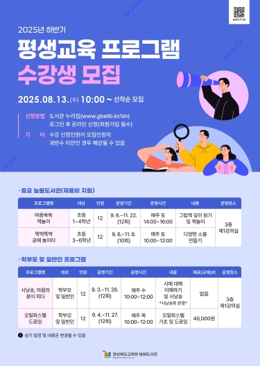 [뉴스노크=김인호 기자] 상북도교육청 봉화도서관(관장 장낙희)은 어린이, 학부모 및 일반인을 대상으로 8월 13일부터 하반기 평생교육 프로그램 수강생을 모집한다.