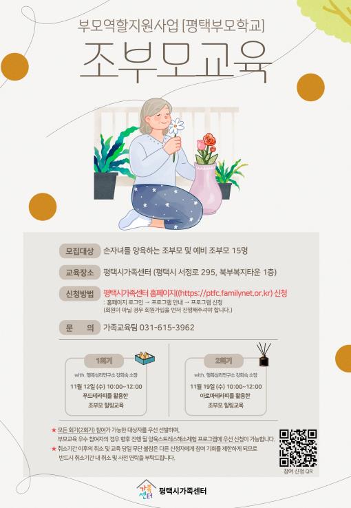 [뉴스노크=김인호 기자] 평택시가족센터는 부모역할지원사업[평택부모학교]의 하나로 손주를 양육하는 조부모 및 예비 조부모를 대상으로 ‘조부모 교육’을 운영한다.