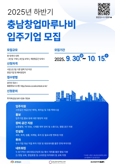 [뉴스노크=김인호 기자] (재)충남창조경제혁신센터는 오는 10월 15일까지 2025년 하반기 충남창업마루나비 입주기업을 모집한다고 밝혔다. 이번 모집은 혁신적인 아이디어와 성장 잠재력을 지닌 스타트업을 발굴해 안정적인 보육 환경을 제공하고, 기업의 지속적인 성장을 지원하기 위해 추진된다.