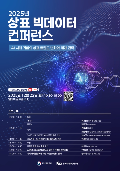 [뉴스노크=김인호 기자] 지식재산처가 주최하고 한국지식재산연구원이 주관하는 ‘2025년 상표 빅데이터 학술회의’가 12월 22일 10시 30분 엘타워 골드홀(서울 서초구)에서 개최된다.