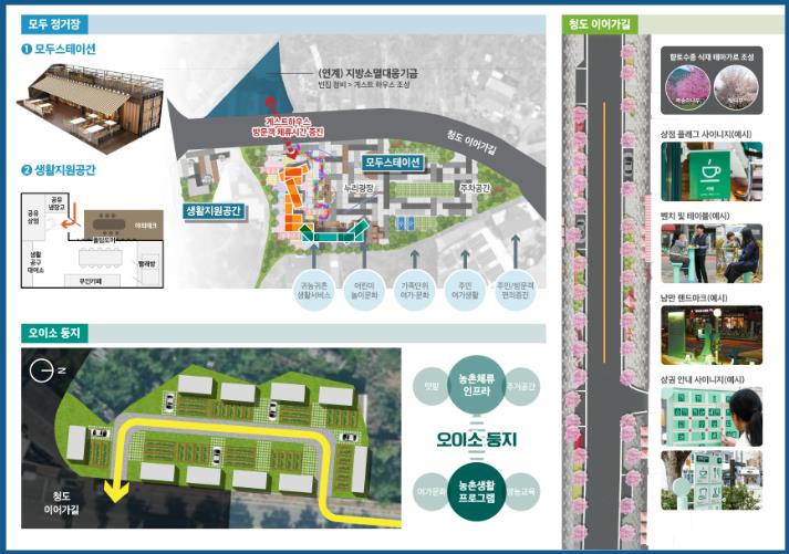 이번에 선정된 “청도로 오이소! 5도 2촌 충전소 조성사업”은 화양읍 도시재생사업, 지역활력타운, 지역개발지원사업, 지방소멸대응기금 등과 연계해 화양읍 동천리 일원에 모두정거장(일상생활지원 및 문화창작소), 오이소 둥지(체류형 살아보기 마을), 청도 이어가길(생활권 연결 보행 테마가로) 등 복합개발을 추진하며 2026년부터 2028년까지 국비25억원을 포함해 67억원을 투자할 계획이다.