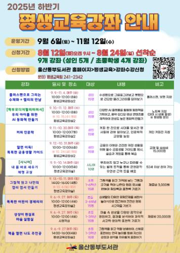 [뉴스노크=김인호 기자] 울산동부도서관은 오는 9월 6일부터 11월 12일까지 초등학생 60명과 지역주민 70명을 대상으로 2025년 하반기 평생교육 강좌를 운영한다.