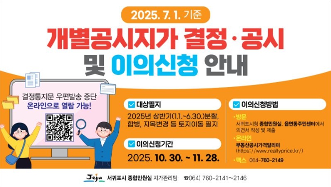 서귀포시 관계자는 “이번 개별공시지가 결정·공시는 시민들에게 투명하고 공정한 부동산 행정을 제공하는 중요한 절차다. 감정평가사 검증 절차를 강화해 신뢰성을 높이고, 전자열람 시스템을 통해 시민들이 더 쉽게 정보를 확인할 수 있도록 하겠다”라고 밝혔다.