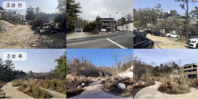 ▲ 공원 조성 전 훼손, 방치된 모습과 조성 후 계절마다 색다른 정취를 즐길 수 있는 ‘사계 정원’ 전경