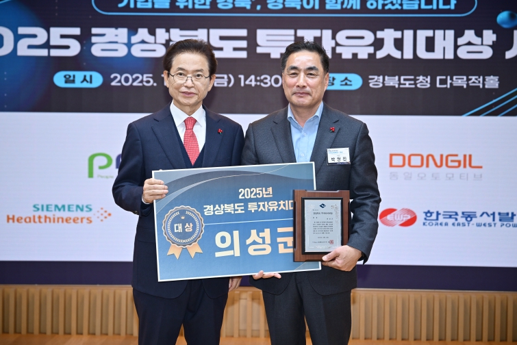 [뉴스노크=김인호 기자] 의성군은 지난 19일 경북도청에서 열린 ‘2025년 경상북도 투자유치대상’ 시상식에서 투자유치 활성화 성과를 인정받아 3년 연속 대상을 수상했다고 밝혔다.
