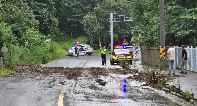▲ 4일 오전 경주시 경감로(지방도 945호선) 구간에 집중호우로 인한 토사가 도로 위로 유출돼 경찰이 현장을 통제하고 있다. 경주시는 토사 제거 작업을 진행 중이다. |
