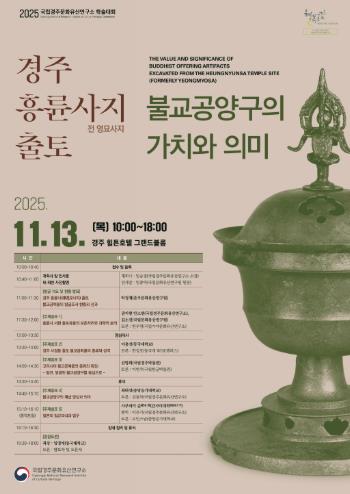 [뉴스노크=김인호 기자] 국가유산청 국립문화유산연구원 국립경주문화유산연구소는 오는 11월 13일 오전 10시 경주 힐튼호텔 그랜드볼룸에서 '경주 흥륜사지(전 영묘사지) 출토 불교공양구의 가치와 의미' 학술대회를 개최한다.