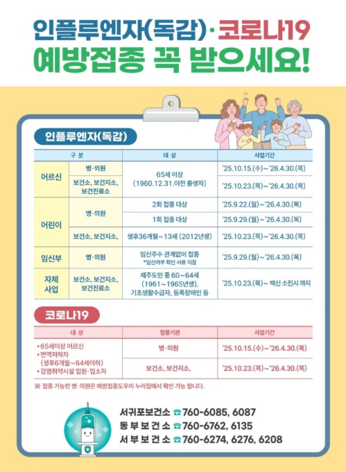 [뉴스노크=김인호 기자] 서귀포시 서부보건소에서는 인플루엔자(독감)와 코로나19 등 동절기 감염병의 예방을 위해 고위험군을 중심으로 예방접종에 적극 참여를 당부했다.