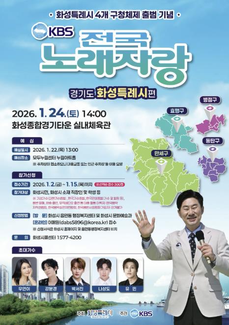 [뉴스노크=김인호 기자] 화성특례시는 다음 달 2일부터 15일까지 ‘KBS 전국노래자랑’ 화성특례시편 참가자를 모집한다고 24일 밝혔다.
