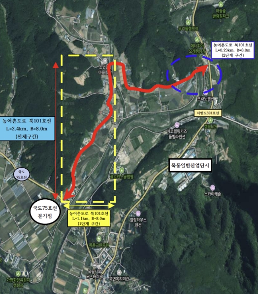 북101호선은 북면 제령리 목동교회 인근에서 소법리 골말교 인근까지 이어지는 총 2.4km 구간이다. 1단계 사업은 2023년 12월 준공과 함께 도로를 개통했으며, 군은 2024년부터 2단계 구간 노선 지정을 위한 행정절차를 진행해 왔다. 이어 올해 1월 보상 협의를 완료하면서 4월 공사 착공을 앞두게 됐다.