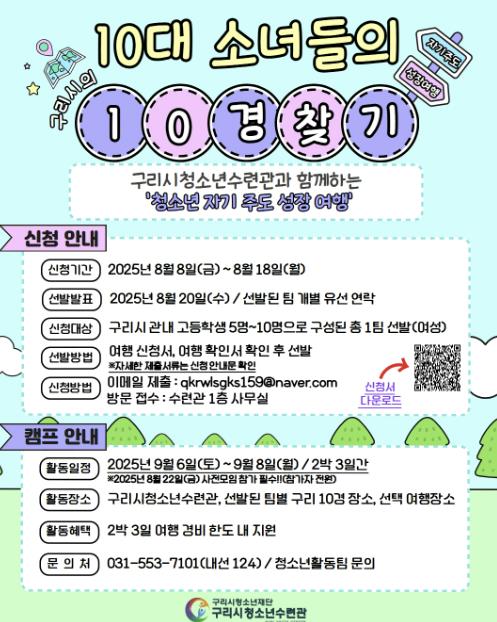 구리시청소년재단 청소년수련관에서는 8월 8일부터 8월 18일까지 ‘10대 소녀들의 구리시 10경 찾기’에 참가할 청소년들을 모집한다. ‘10대 소녀들의 구리시 10경 찾기’는 청소년들이 자기 주도적으로 자신이 살고 있는 지역인 구리시를 여행하며 자기만의 구리시 ‘10경’을 찾고, 지역 탐방과 사회적 경험을 쌓는 기회를 제공하기 위해 마련됐다.