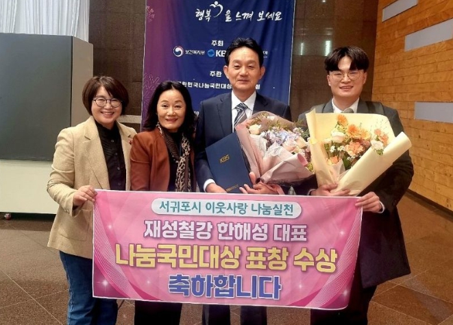 [뉴스노크=김인호 기자] 서귀포시는 재성철강 한해성 대표가 2014년부터 11년간 이웃사랑을 적극 실천해 온 공로를 인정받아 11월 6일 서울 KBS 본사에서 열린 ‘2025년 나눔국민대상 시상식’에서 민간단체장 대표수상자로 표창(KBS사장 표창)을 수상했다고 밝혔다.