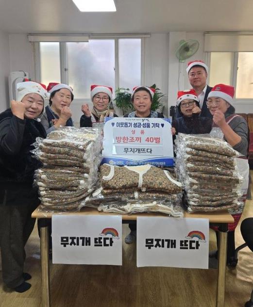 ‘무지개 뜨다’ 회원들은 다문5리 경로당을 직접 방문해 방한조끼와 간식 쿠키를 전달하며 어르신들의 안부를 살피는 시간을 가졌다.