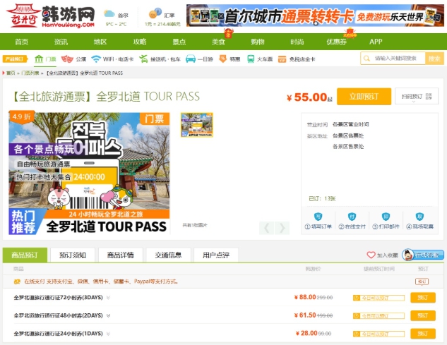 [뉴스노크=김인호 기자] 전북특별자치도는 도내 대표 관광상품인 ‘전북투어패스’를 중국 최대 한국 여행 정보 플랫폼인 ‘한유망(韩游网)’에 입점시키고 이달부터 본격적인 판매에 돌입했다고 12일 밝혔다.