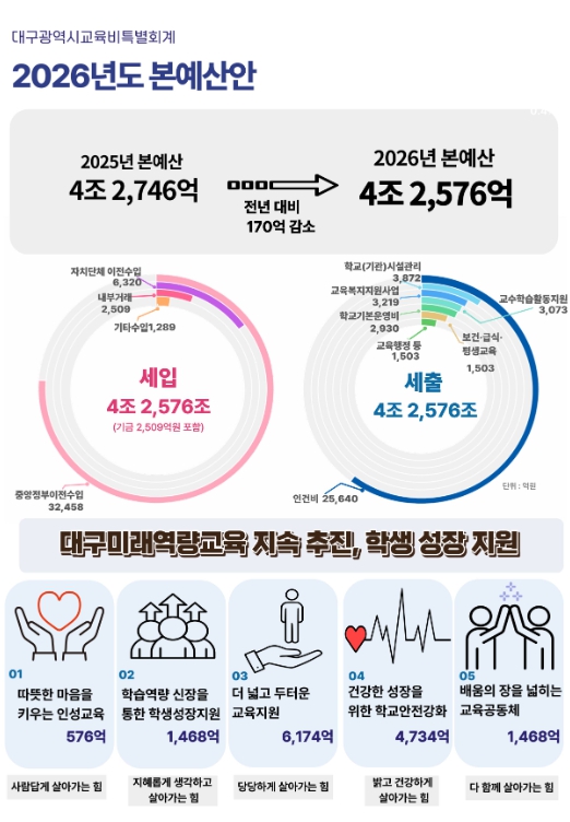 [뉴스노크=김인호 기자] 대구시교육청은 2026년도 대구광역시교육비특별회계 예산안을 올해 예산보다 170억 원 감액된 4조 2,576억 원으로 편성해 10월 27일 대구시의회에 제출했다고 밝혔다.