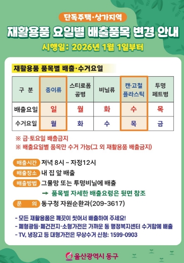 [뉴스노크=김인호 기자] 울산 동구가 2026년 1월 1일부터 월요일, 목요일의 재활용품 수거 품목을 변경 시행한다고 밝혔다.