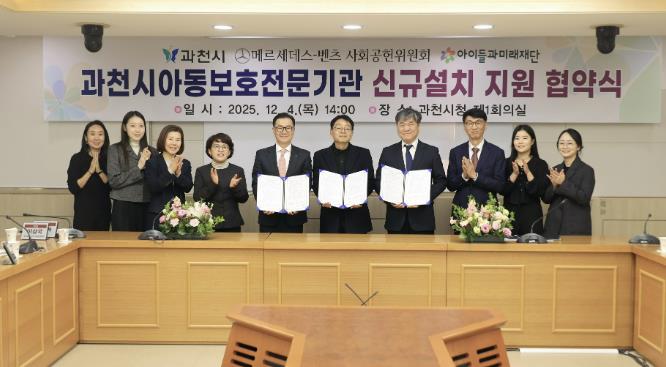 [뉴스노크=김인호 기자] 과천시는 지난 4일 시청 회의실에서 메르세데스-벤츠 사회공헌위원회 및 사회복지법인 아이들과미래재단과 ‘과천시아동보호전문기관 신규 설치’를 위한 협약식을 개최했다고 밝혔다.