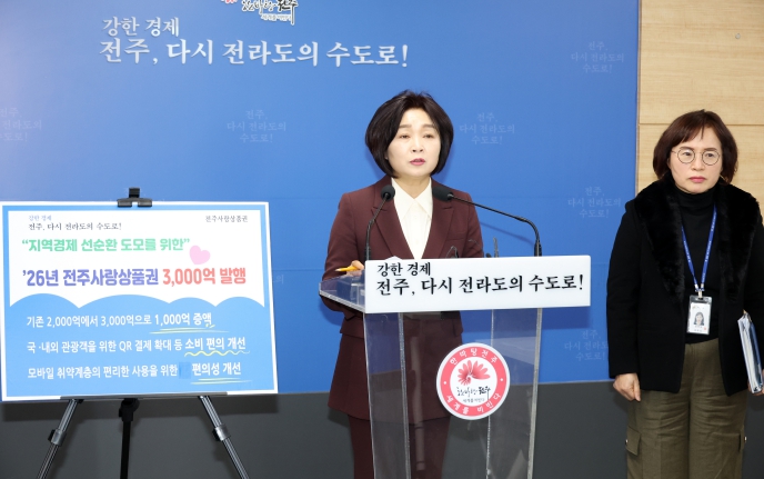 임숙희 전주시 경제산업국장은 “전주시는 2025년 한 해 침체된 민생경제의 회복을 위해 골목상권 활성화 등 다양한 정책을 추진해왔다”면서 “다가오는 2026년 새해 전주사랑상품권 발행 규모 증액 및 특례 보증 대출금 확대 등 지역경제 활성화를 위한 마중물을 확보해 상권의 회복이 가시화될 수 있도록 전력을 다하겠다”고 말했다.