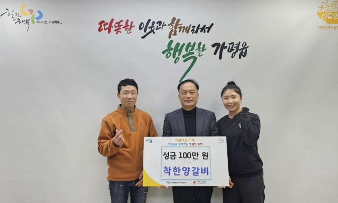 [뉴스노크=김인호 기자] 가평군 가평읍 경춘로 소재 착한양갈비는 지난 19일 행정복지센터를 방문해 이웃돕기 성금 100만 원을 기탁했다.