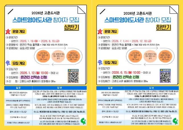 [뉴스노크=김인호 기자] 김포시 고촌도서관이 2026년 1월 19일부터 12월 18일까지 ‘2026년 스마트영어도서관’을 운영한다.