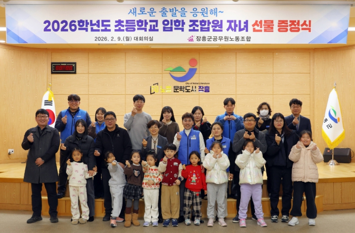 [뉴스노크=김인호 기자] 장흥군과 장흥군공무원노동조합은 지난 9일, 2026학년도 초등학교 입학을 앞둔 조합원 자녀와 가정을 격려하는 행사를 열고 학용품 세트를 전달했다.