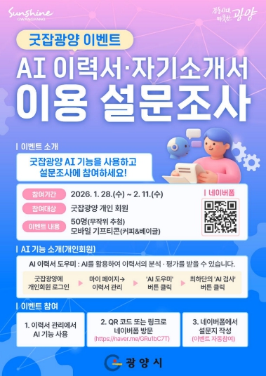 이번 이벤트는 1월 28일부터 2월 11일까지 진행되며, 굿잡광양 누리집에 이력서를 등록하고 AI 도우미 기능을 활용한 개인회원이라면 누구나 설문조사에 참여할 수 있다.