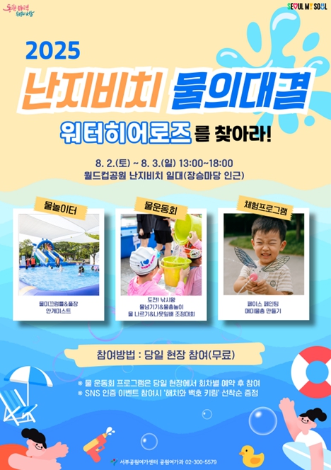 본격적인 휴가 기간인 8월 초의 무더위를 시원하게 이겨낼 수 있는'2025 난지비치 물의 대결! 워터히어로즈를 찾아라!'는 물놀이터, 물 운동회, 체험 부스 등으로 구성된 여름 물놀이 행사로, 공원을 찾는 가족들에게 시원한 여름 바캉스를 선사할 예정이다.