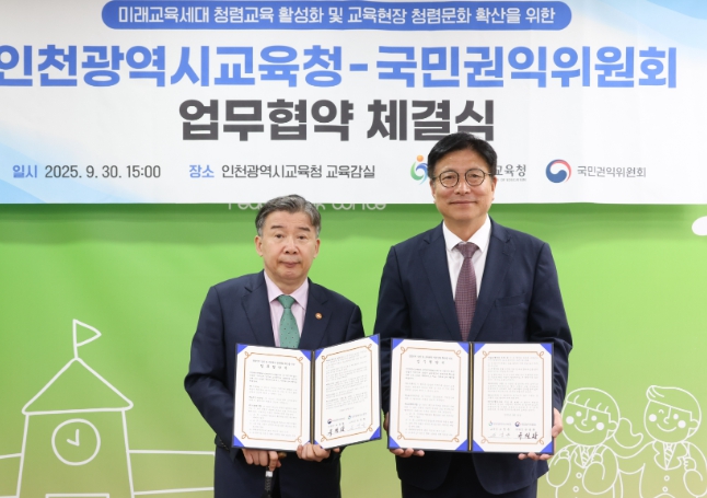 [뉴스노크=김인호 기자] 인천광역시교육청은 9월 30일 국민권익위원회와 청렴한 미래인재 양성과 교육 현장의 청렴 문화 확산을 위한 업무협약을 체결했다.