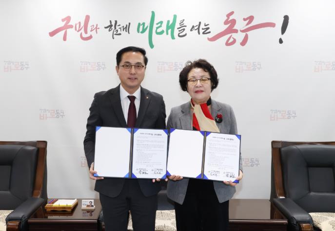 | ▲ 위수탁 협약 체결 모습(왼쪽 박희조 동구청장, 오른쪽 김경옥 이사장) |