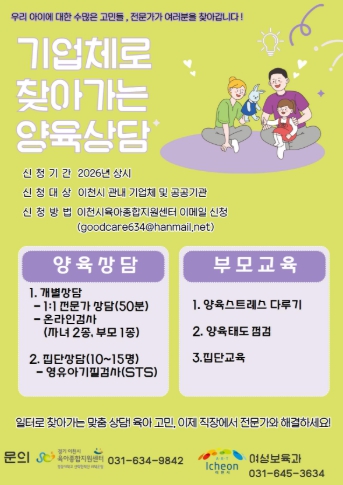 이천시 육아종합지원센터 관계자는 “아이를 키우는 부모라면 누구나 고민이 있지만, 직장 생활로 인해 상담의 기회를 놓치는 경우가 많다”라며, “직접 찾아가는 서비스를 통해 부모의 양육 부담을 덜고, 건강한 양육 환경을 조성하는 데 최선을 다하겠다”라고 전했다.