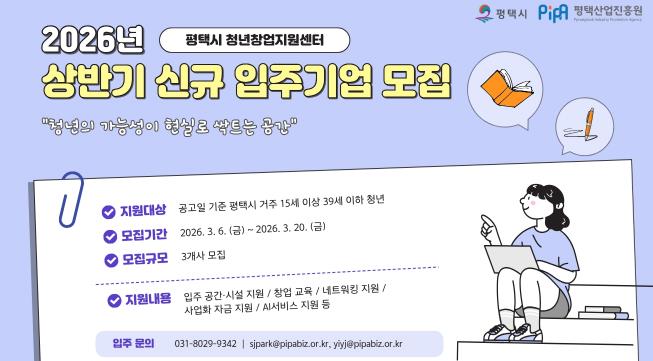 | ▲ 평택시와 평택산업진흥원, 2026년 청년창업지원센터 신규 입주기업 공개모집 |