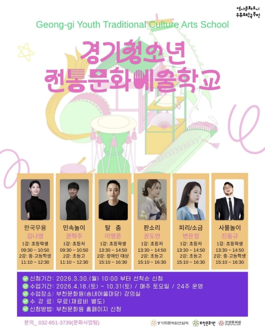 [뉴스노크=김인호 기자] 부천문화원은 청소년들의 전통문화 참여 기회를 확대하고 경기지역 전통민속예술의 지속 가능한 전승 기반 마련을 위한 ‘2026 경기청소년전통문화예술학교’ 참여 학생을 모집한다.