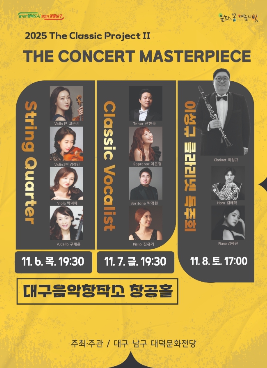 지난 6월 K-Classic 국악을 주제로 해금, 한국무용, 판소리로 구성한 '한국 전통의 미 樂(악)·舞(무)·歌(가)'에 이어 오는 11월6일부터 8일까지 대구음악창작소 창공홀에서 펼쳐질 이번 시리즈는 [The Concert MASTER-PIECE] 란 타이틀로 관객들을 만난다.